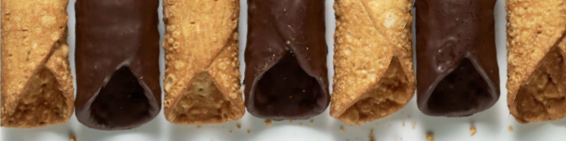 Cannoli Shells – Our light and crispy cannoli shells are traditionally filled with cannoli cream, but may also be used with many other fillings, such as ice cream, mousses, custards and whipped cream. You can garnish your filled cannoli with powdered sugar, chocolate drizzle, cinnamon, sprinkles, pistachios, coconut, chocolate chips or cherries…the possibilities are endless! Available: Classic & Chocolate Dipped.